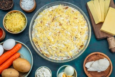 Отвариваем куриное филе до готовности. Затем нарезаем небольшими кусочками. Оставляем пару ложек бульона.