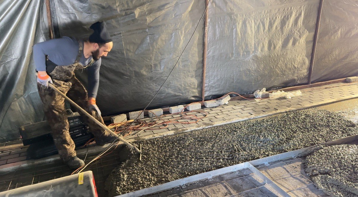 Вместе с тем, несмотря на минусовые температуры наружного воздуха, работы на объекте не прекращаются. Над местами выполнения бетонных работ устроены закрытые каркасные "тепляки", в которых поддерживается необходимый температурный режим с использованием электро— и дизельных тепловых пушек. Это делается для того, чтобы не допустить заморозку бетона, — отметила Ирина Пёрышкина.