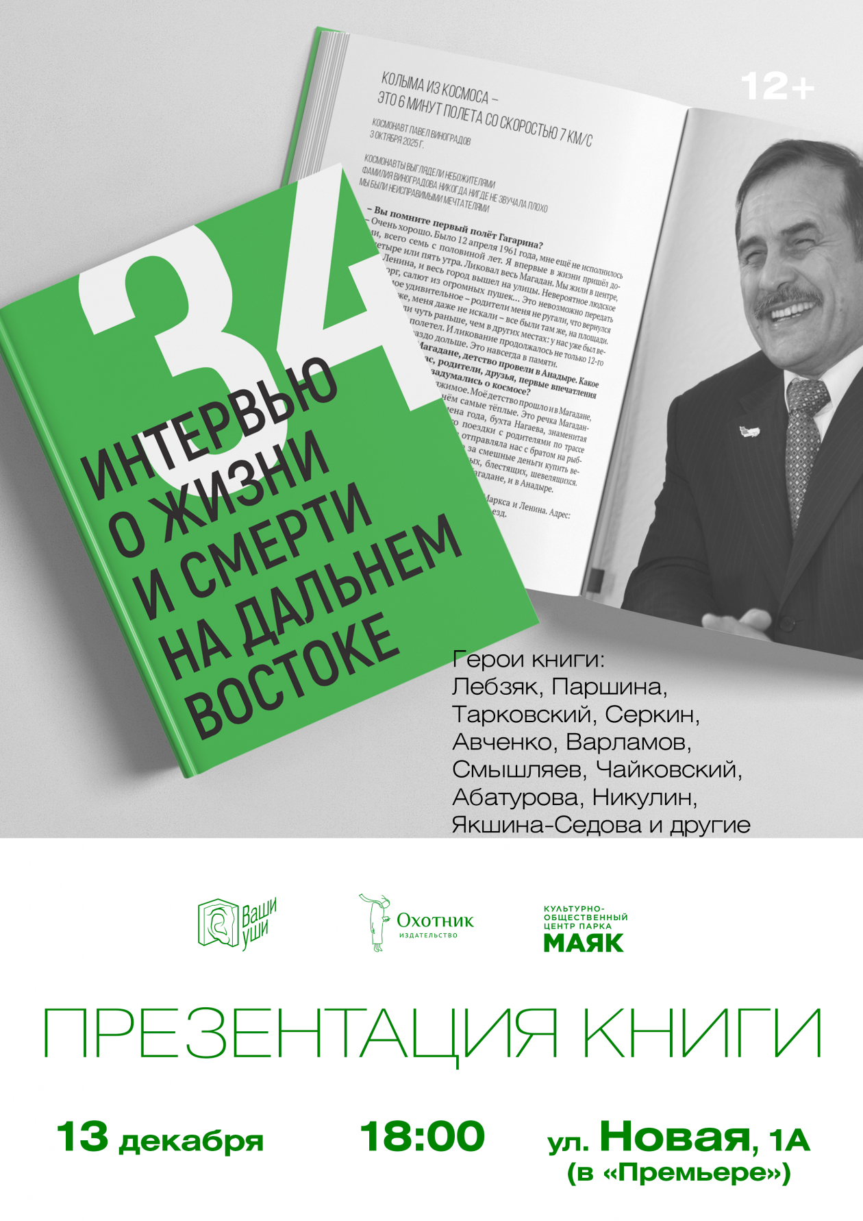 MagadanMedia, 9 декабря. 13 декабря в 18:00 в Культурно-образовательном центре парка "Маяк" пройдёт презентация новой книги подкаста "Ваши уши" и издательства "Охотник" — "34 интервью о жизни и смерти на Дальнем Востоке", сообщает ИА MagadanMedia.