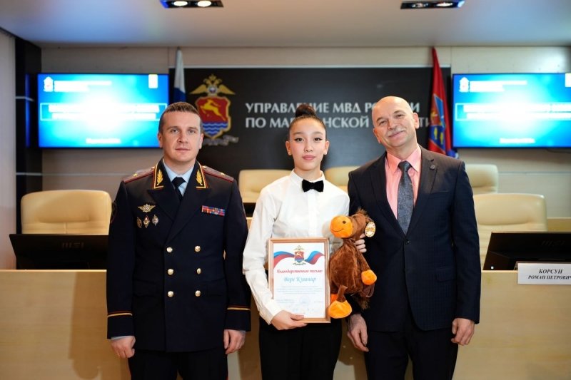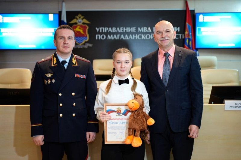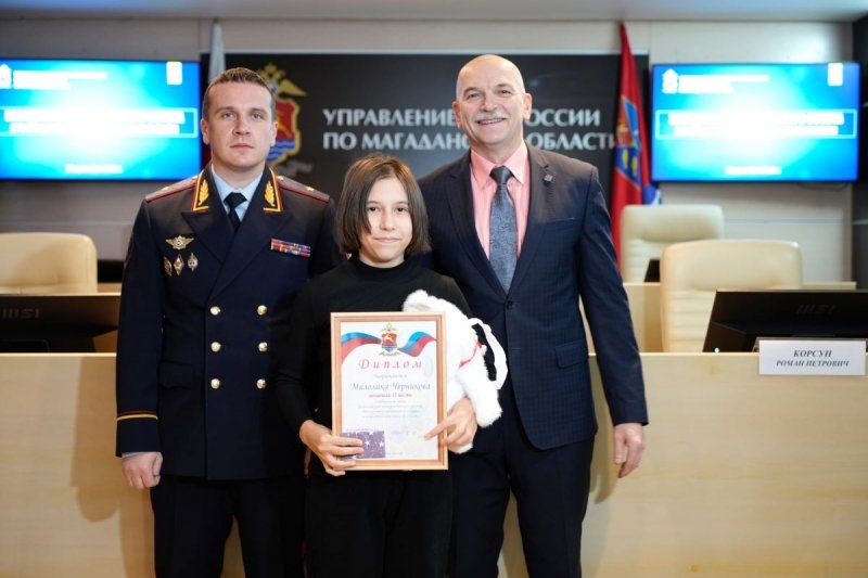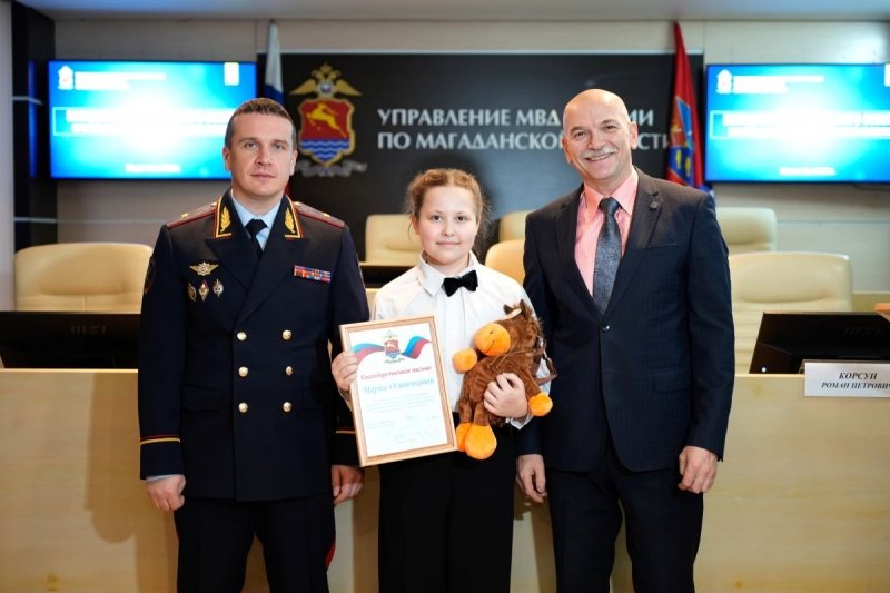 Мероприятие началось с награждения победителей регионального этапа конкурса МВД России "Мои родители работают в полиции". Начальник УМВД России по Магаданской области генерал-майор полиции Дмитрий Князев и председатель Совета Роман Корсун вручили грамоты и подарки Злате Васильевой, Ариане Козыревой, Милолике Черниковой и Кате Свижук. Также было отмечено, что победители из отдаленных районов, которые не смогли приехать, обязательно получат свои призы.