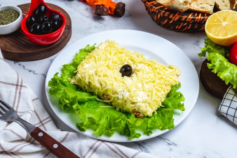 Заправляем блюдо майонезом, солим и выкладываем на блюдо горкой. Густо посыпаем тёртым сыром. Приятного аппетита!