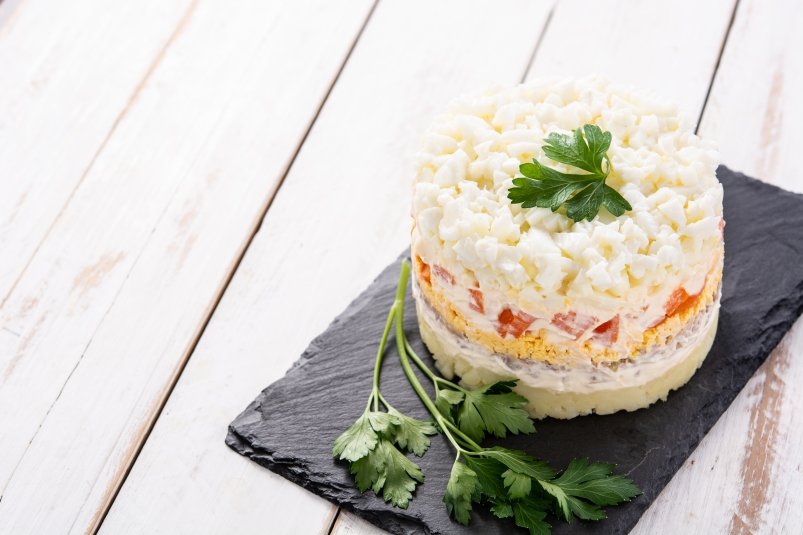 Салат "Русалка" готов к подаче на стол, но лучше настоять его пару часов, чтобы уплотнились слои. Приятного аппетита!