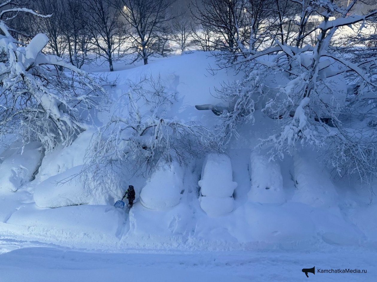 Обычный двор в Петропавловске-Камчатском. Последний раз снег убирали в середине декабря. После всех циклонов проезд полностью заблокирован уже две недели. Невозможно вывезти мусор, проехать пожарным и скорой, подвести товары в окрестные магазины. Попытка погрузчика пробиться в соседний двор закончилась крахом — спецтехника чуть не свалилась в яму со свежеоткопанным автомобилем, а потом превратила въезд в площадку для могула с трамплинами и ухабами.