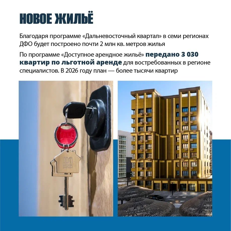 По программе "Дальневосточный квартал" в ДФО планируется 2 млн кв. м жилья. Более трех тысяч семей специалистов получили квартиры по льготной аренде.