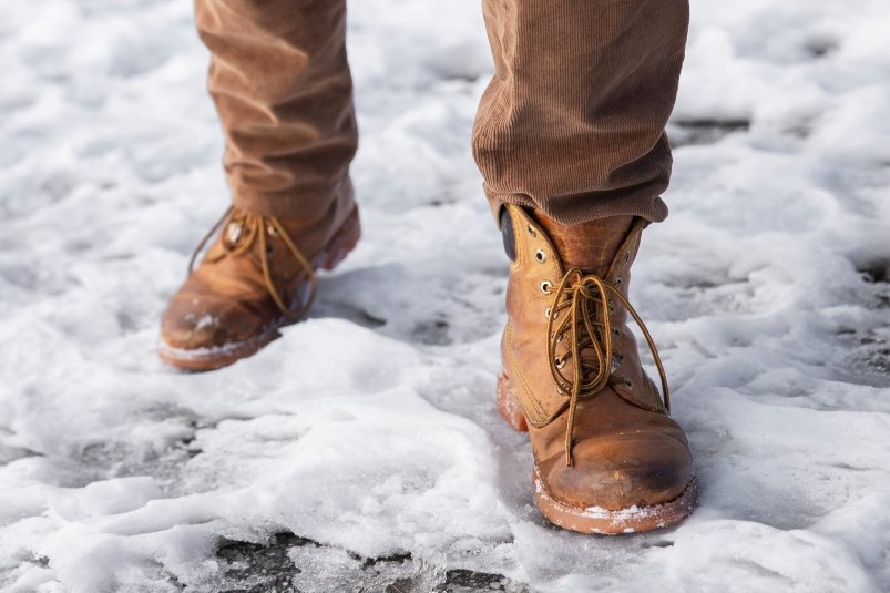 Получившиеся металлические сетки натягиваем на подошвы и носы ботинок. Теперь можно смело выходить на улицу, не боясь упасть на льду. Да, такой вариант — не самый эстетичный, на постоянку он не подходит, но как экстренная мера, безусловно, рабочий.