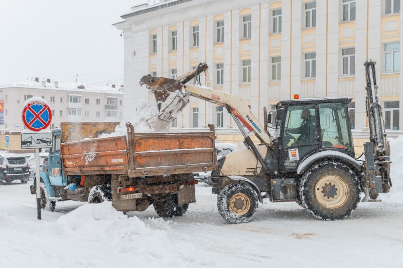 Фронтальные погрузчики и самосвалы грузят снег, расчищают заезды, остановочные карманы, вывозят снег на Советской, Гагарина, Набережной реки Магаданки, проспекте Карла Маркса.