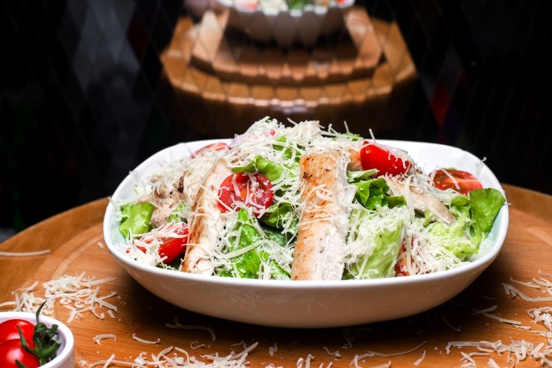На плоском блюде соединяем лук с грибами, курицу, огурцы, заправляем салат майонезом и подсаливаем. Выкладываем его горкой и густо посыпаем тёртым сыром.
