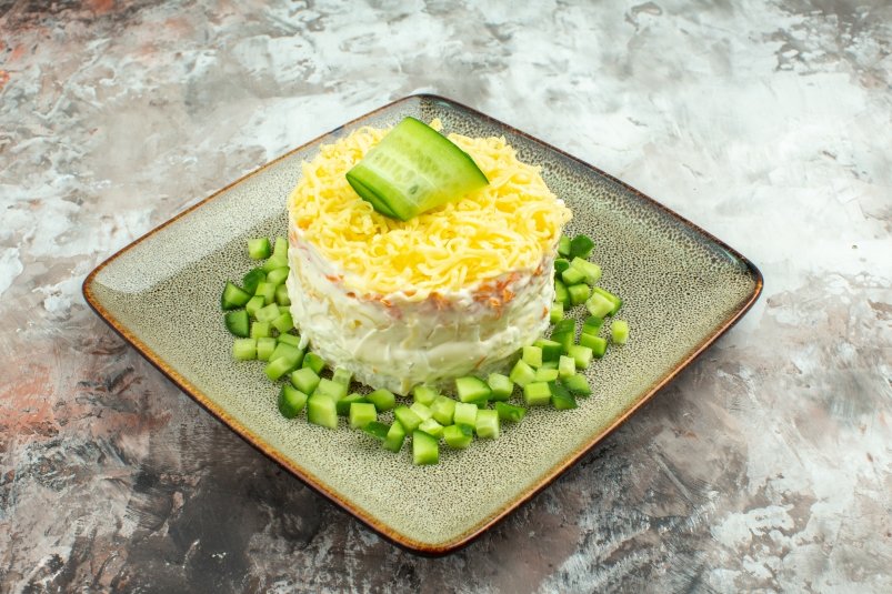 Слои солим и промазываем майонезом. Это очень вкусно и сытно. Подаём салат "Моя цыпа" к столу.