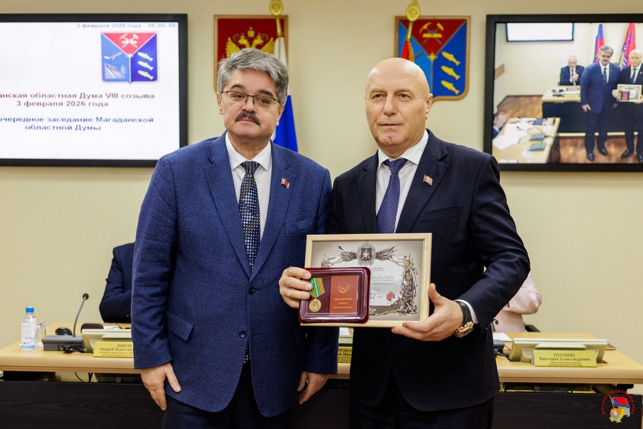 Председатель Магаданской областной Думы Анатолий Широков на заседании, выполняя просьбу командира отдельного полка беспилотных систем "Буревестник" Романа Аничина, вручил благодарственное письмо и медаль Добровольческого корпуса Министерства обороны за вклад в повышение обороноспособности России и решение задач в рамках специальной военной операции первому заместителю Председателя заксобрания Александру Басанскому.