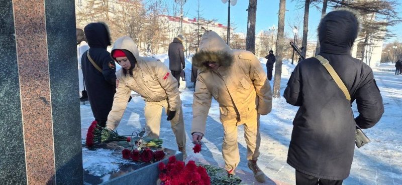 К подножию памятника землякам-колымчанам, погибшим в Афганистане, Чечне и других локальных конфликтах были возложены живые цветы.