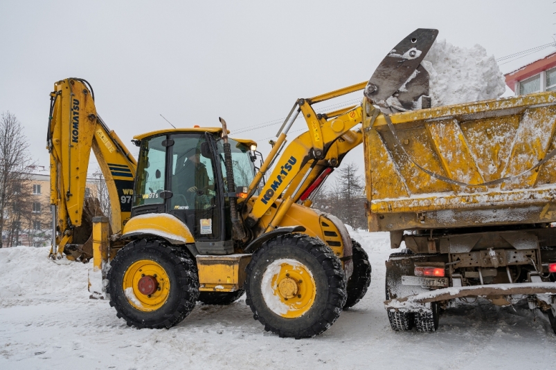 Фронтальные погрузчики и самосвалы ГЭЛУД грузят снег, расчищают заезды, вывозят снег на улицах Транспортной, Речной, Дукчинском шоссе.