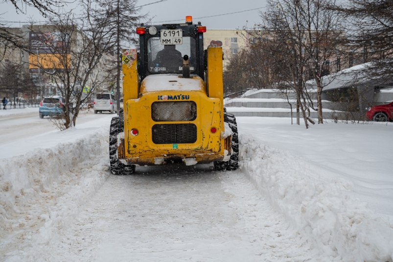 Автогрейдер срезает накат и нарезает снежные валы на Пролетарской, Набережной реки Магаданки, Совхозной и Рыбозаводской.