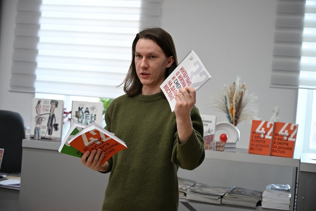 Главной новинкой стала книга Г. Дж. Дулькейта "По островам и побережью Охотского моря. Путевые записи 1924-1928 гг." (18+), выпущенная при поддержке областных организаций и предпринимателя И. Б. Донцова. Презентацию сопроводили показом фильма Анастасии Якубек о биологе. Журналист Дмитрий Андреев представил проект по мотивам подкаста "Ваши уши" (18+) — серию книг "Интервью о жизни и смерти на Дальнем Востоке" (18+) и фотовыставку с портретами героев интервью "Что значит жить на Колыме?" (18+). Также читателям рассказали о четырех томах "Дневников геолога" (18+) Бориса Вронского, первооткрывателя месторождений на Колыме, который начинал поиски именно в этих местах.