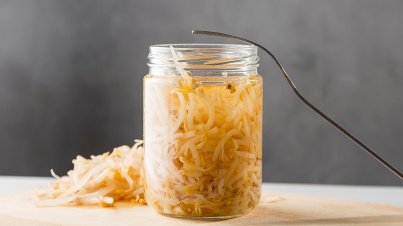 Поливаем капусту в банке маслом, сверху выливаем горячий маринад. Даём капусте остыть при комнатной температуре, а затем закрываем банку и отправляем в холодильник на 6 часов.