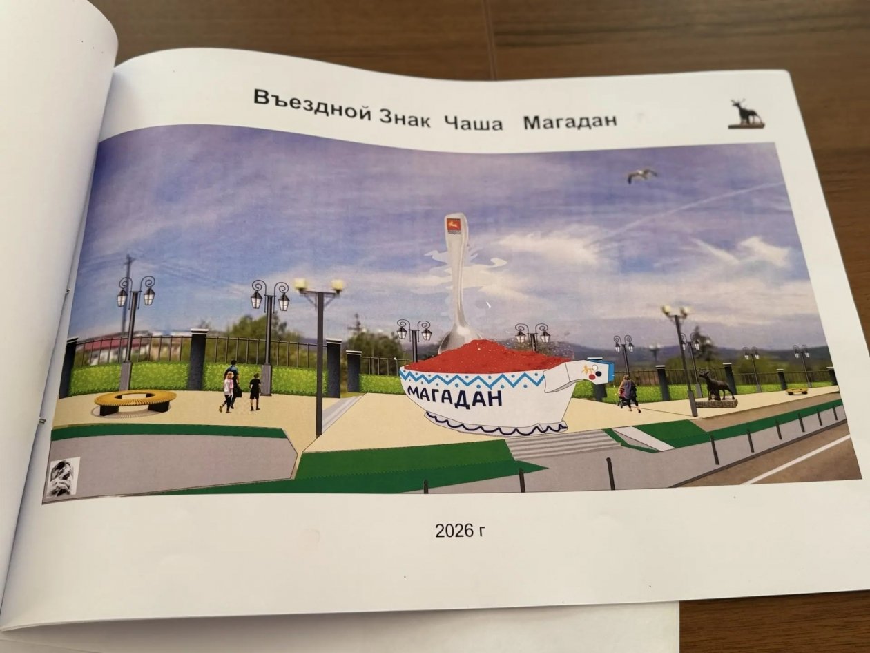 Въездной знак "Чаша Магадан" — проект Константина Потороки. Идея автора — показать богатство колымского края: чаша, как символ благосостояния и благополучия, полна икры, а в ней ложка, которая дает отсылку к добыче.