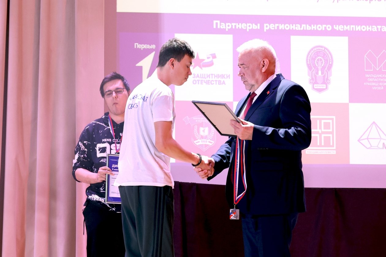 Андрей Зыков вручил призерам чемпионата "Абилимпикс" дипломы II степени. Наградами были отмечены студенты Магаданского областного центра образования № 1 Арнольд Богатырев ("Флористика"), Ольга Кузнецова ("Мастер по обработке текста"), Даниил Журавлев ("Столярное дело"), Оксана Исакова ("Вязание спицами"), Кирилл Жданов ("Программирование"), Даниил Жданов ("Блинопек"), представители Колледжа сервиса и технологий Кристина Абдулаева ("Повар региональной кухни (выпечка расстегай "Северный")), Елизавета Миронова ("Выпечка хлебобулочных изделий"), Иван Комаров ("Мастер по приготовлению пиццы студенты"), Антон Галеев ("Мастер по обработке текста"), ученики Магаданской областной школы-интерната Юлиана Кацан ("Швея"), Иван Поповенко ("Столярное дело"), студенты Строительно-технического колледжа Евгений Зайнутдинов ("Облицовка плиткой"), Андрей Скрыбыкин ("Слесарное дело"), учащийся Магаданского колледжа искусств Рамазан Увижев ("Звукорежиссура"), представитель Магаданского областного центра образования № 2 Егор Захаров ("Работник зеленого хозяйства"), ветераны СВО Алексей Рожков ("Столярное дело") и Николай Голубничий ("Сварочные технологии"), а также Елена Чутова ("Художественное вышивание"), Иван Соколов ("Мастер по приготовлению пиццы"), Дмитрий Дунькович ("Бисероплетение").
