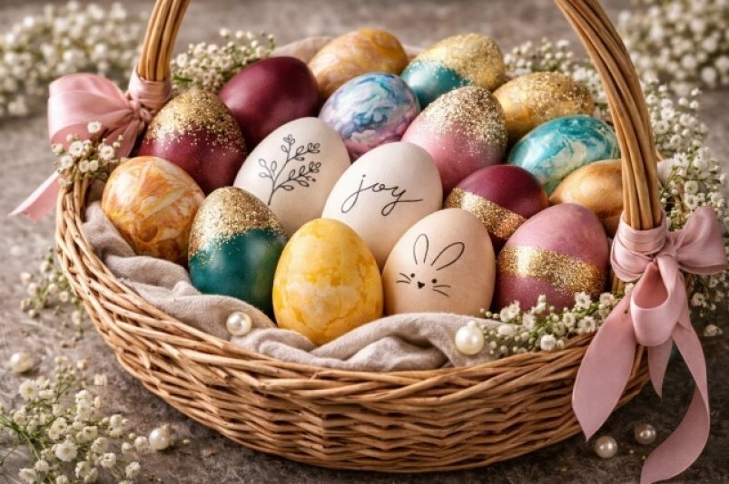 Золото, серебро и перламутровые покрытия добавляют праздничности. Их используют как акцент — например, для нескольких яиц в композиции. Важно сохранять баланс и не перегружать общий вид.