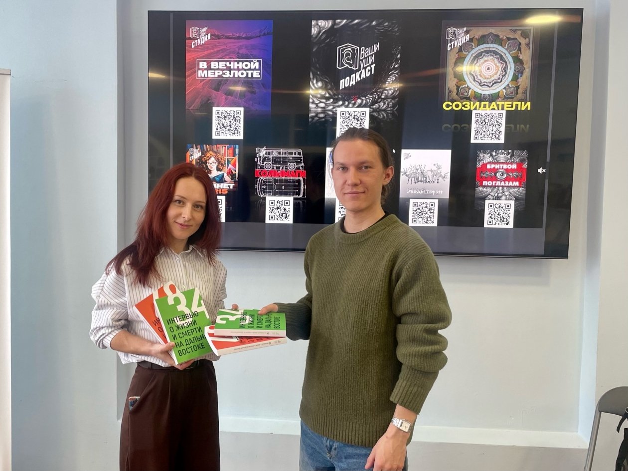 В завершение встречи Дмитрий подарил библиотеке книги издательства "Охотник" — "42..." и "34 интервью о жизни и смерти на Дальнем Востоке".
