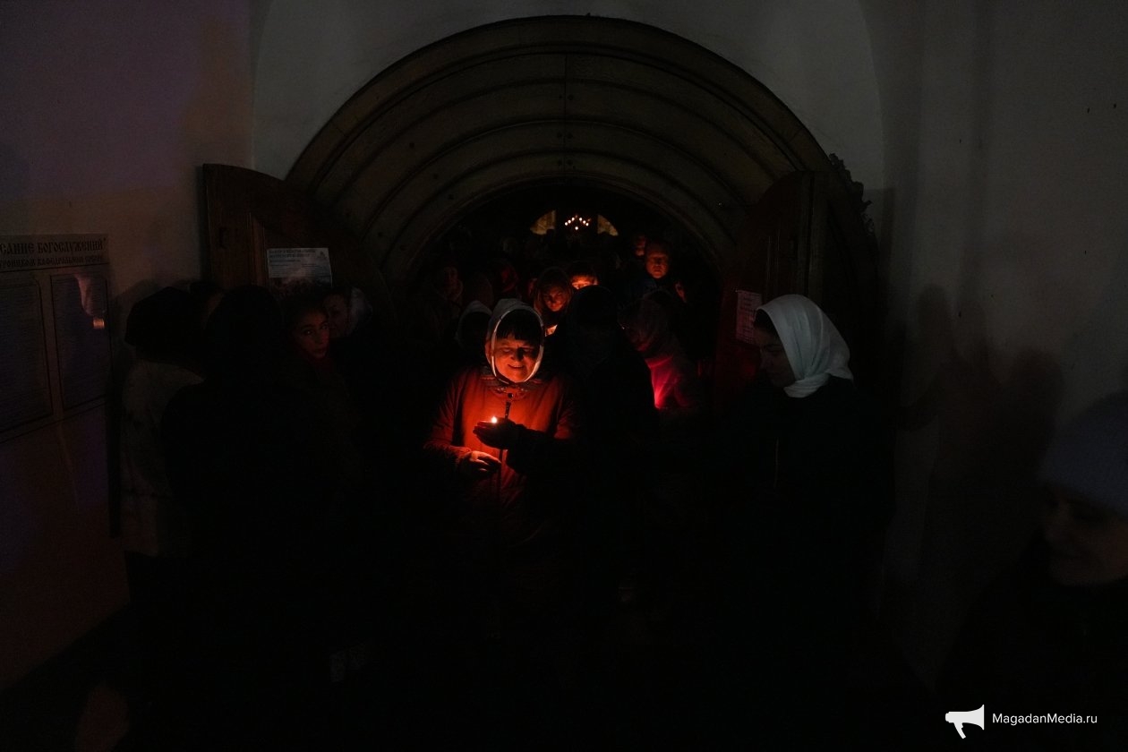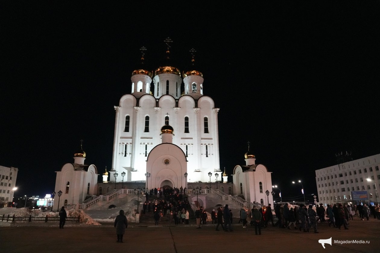Православные жители Магадана собрались на ночные богослужения и Крестный ход в Свято-Троицком кафедральном соборе, куда пришли сотни прихожан. Они совершили Крестный ход вокруг храма, участвовали в Божественной литургии и после службы освятили куличи и яйца.
