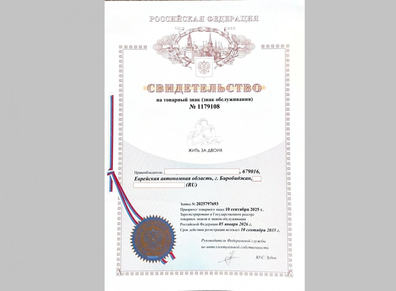 EAOMedia, 16 апреля. Регистрацию в Федеральной службе по интеллектуальной собственности получил символ зародившегося в ЕАО социального проекта "Жить за двоих", в рамках которого создаются уникальные шевроны, где вышиты силуэты в память о самых дорогих людях — мужьях и сыновьях, отдавших жизни за Родину. О регистрации символа проекта сообщила в MAX (18+) губернатор ЕАО Мария Костюк.