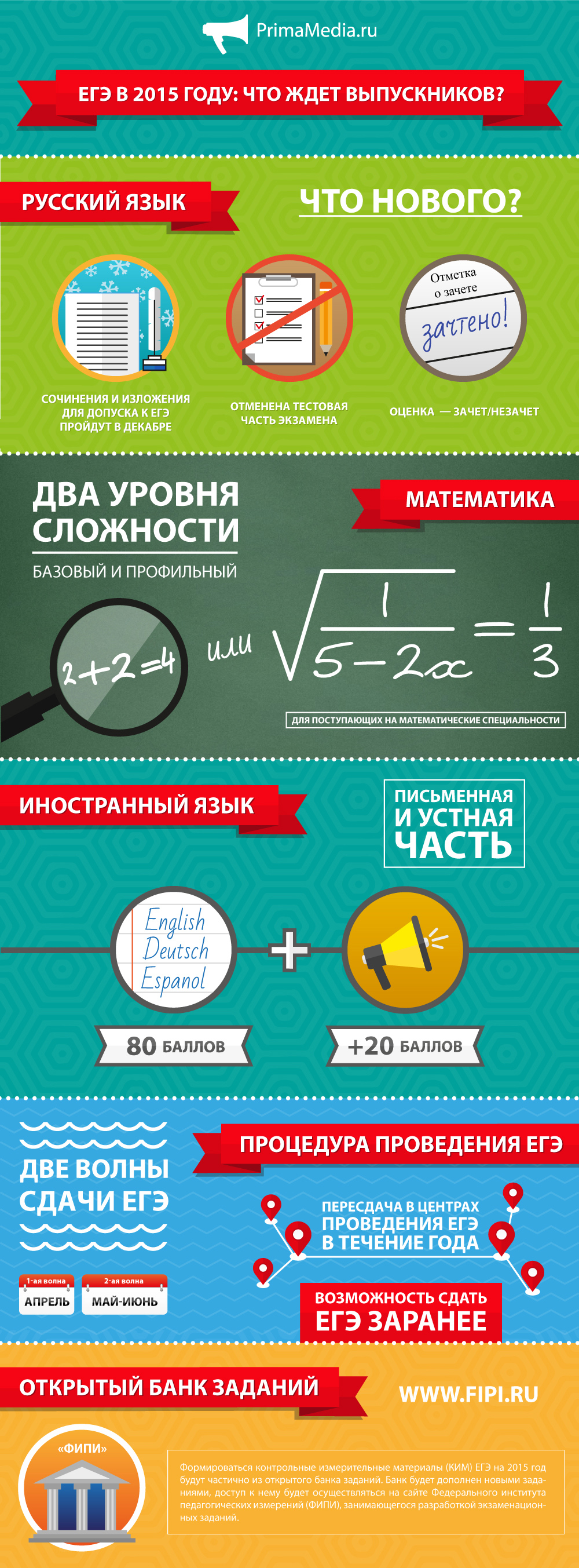 Выпускные экзамены в российских школах в новом учебном году претерпят ряд изменений. Для участников ЕГЭ вводятся профильный экзамен по математике и устная часть экзамена по иностранным языкам. Чтобы получить допуск к ЕГЭ, выпускники должны будут успешно написать сочинение. Проводить ЕГЭ планируется не в три, а в две волны — в апреле и в мае-июне, сообщает РИА PrimaMedia со ссылкой на сайтРособрнадзора.