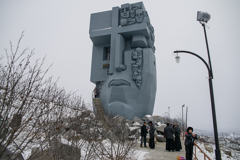 Справка: Монумент "Маска Скорби" работы Эрнста Неизвестного и Камиля Казаева был открыт на сопке Крутой при въезде в Магадан в 1996 году. На этом месте располагалась "Транзитка" — перевалочный пункт, с которого заключенных отправляли по лагерям. Скульптура изображает лицо человека, из левого глаза которого текут слезы, а правый глаз представляет из себя окно с решеткой, за которой находится копия типичной тюремной камеры того времени.