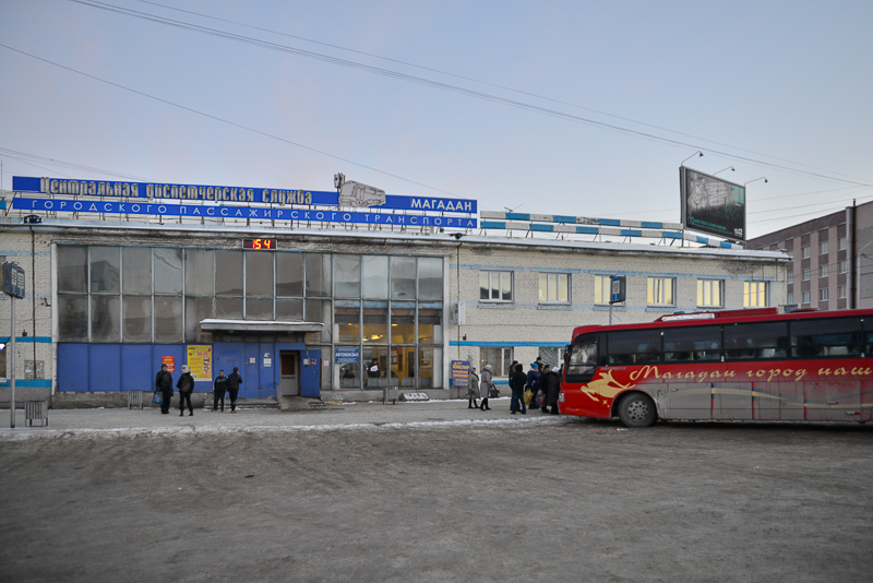 Автовокзал появился в Магадане в начале 1950-х годов. Примечательно, что само здание было построено из фанеры. Как писал журналист Николай Добротворский, каждый день этот небольшой павильон "принимал" 10 междугородных автобусов и два маршрутных такси. За год фанерный вокзал обслуживал до 80-ти тысяч пассажиров. Пассажирские перевозки в Магадане росли с каждым годом, но при этом в автовокзале не было зала ожидания, камеры хранения и даже водопровода и туалета.