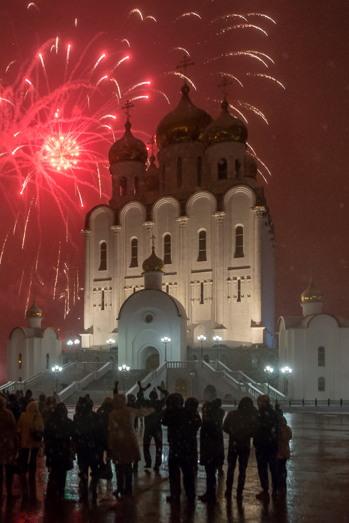 После окончания фильма, за час до полуночи, над площадью грянул салют. Посмотреть на представление не смотря на снег с дождем и ветром собрались более тысячи человек.