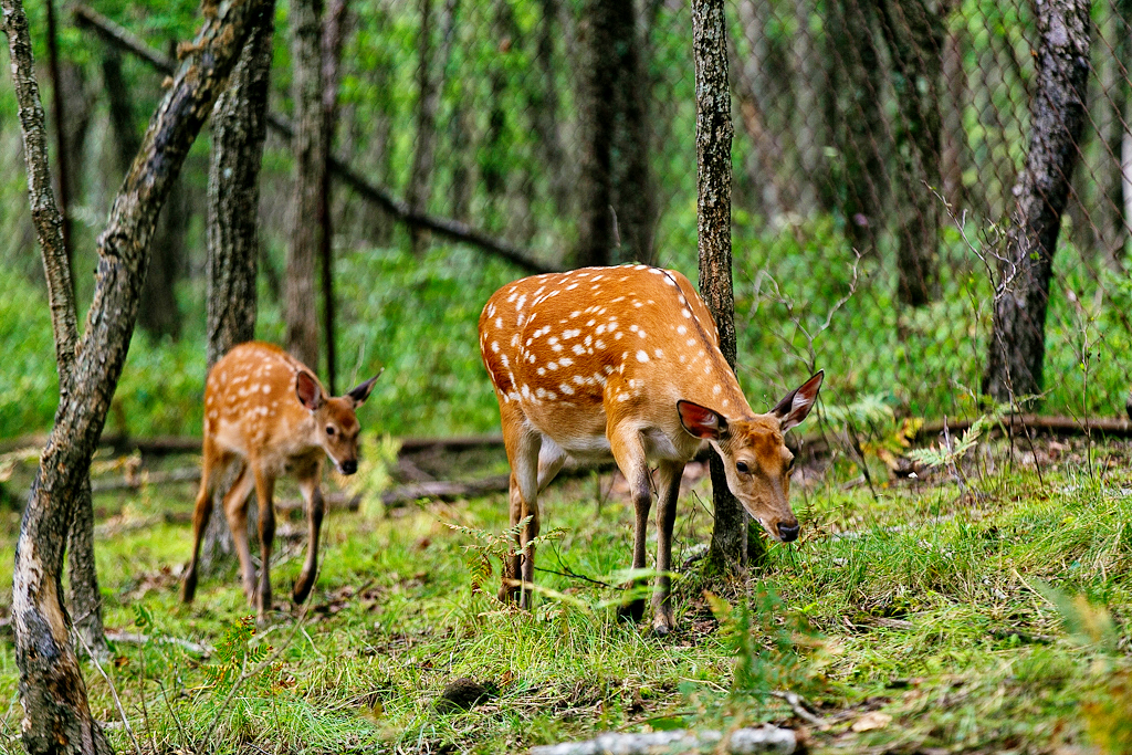 Большое место в сафари-парке занимают копытные обитатели приморской тайги. На одном участке леса здесь можно увидеть пятнистых оленей и изюбрей, косулю, кабаргу и кабана. Многих из зверей можно гладить и даже кормить. Совместное проживание этих животных иначе как уникальным также не назовешь — раньше такое также считалось невозможным.