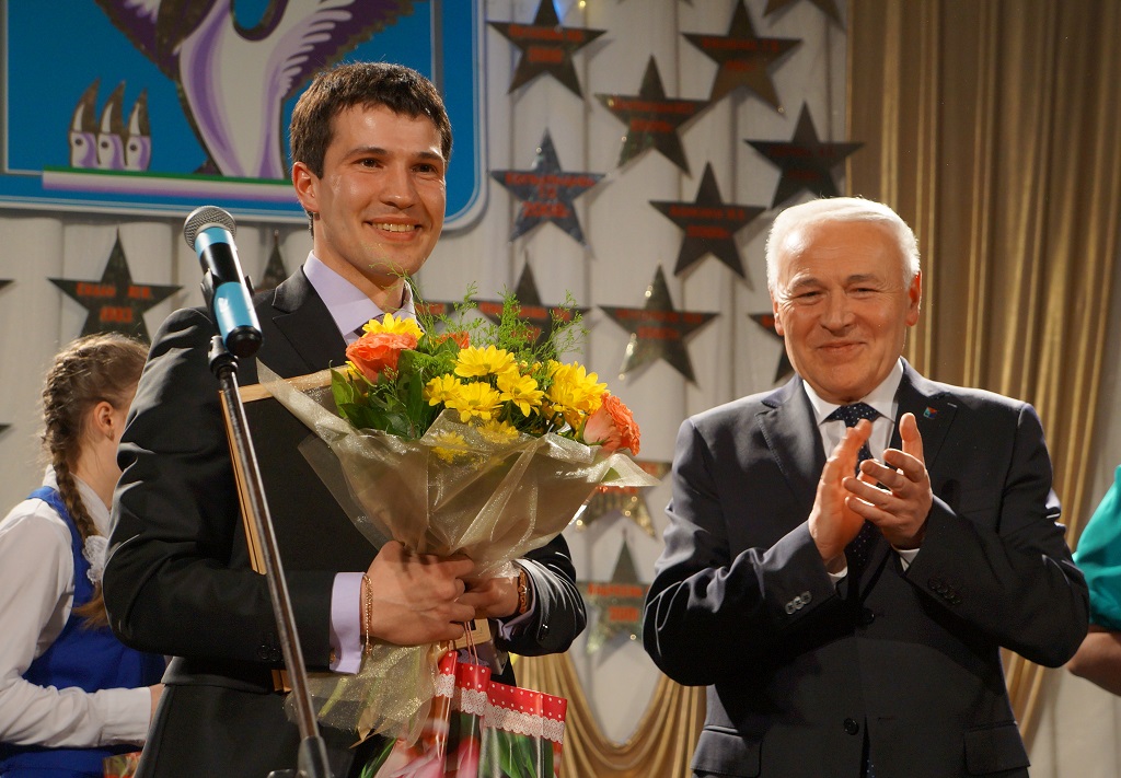 Диплом победителя регионального соревнования и сертификат на приобретение автомобиля получил учитель начальных классов Средней общеобразовательной школы поселка Усть-Омчуг, выпускник СВГУ Ян Ищенко. Высокую награду педагогу вручил глава Колымы Владимир Печеный.
