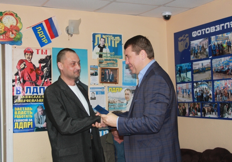 Иван Абрамов наградил члена Координационного совета ЛДПР Максима Фукса. Фото: Фото: Пресс-служба Магаданского регионального отделения ЛДПР