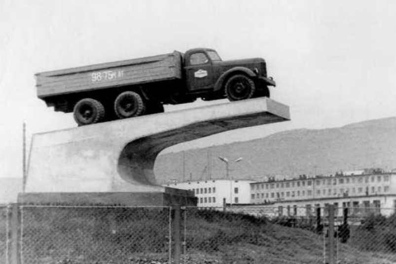 МАЗ-200 установленный на постаменте на Колымской трассе у поселка Палатка. Фото: Фото: kolymastory.ru