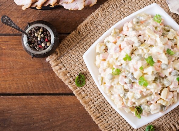Соединяем ингредиенты в миске. Солим и перчим по вкусу, заправляем салат майонезом и перемешиваем. Приятного аппетита!