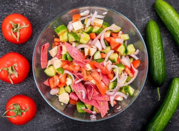 Помидоры нарезаем небольшими дольками, а колбасу — соломкой. Сыр натираем на крупной терке. Чеснок пропускаем через пресс.