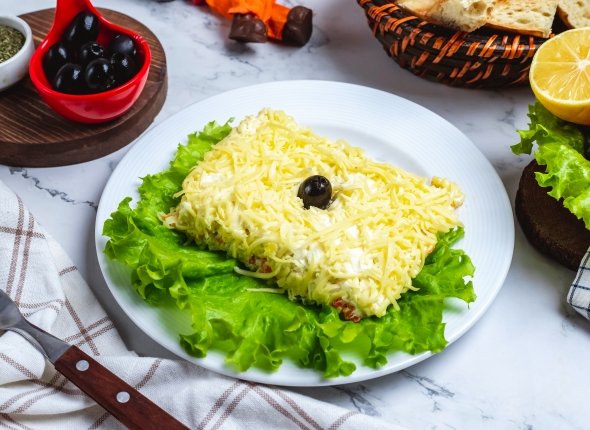 Заправляем блюдо майонезом, солим и выкладываем на блюдо горкой. Густо посыпаем тёртым сыром. Приятного аппетита!