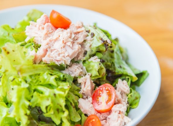 С тунца слить жидкость, мякоть немного растолочь вилкой. Все продукты соединить в салатнике, по вкусу подсолить, заправить майонезом.