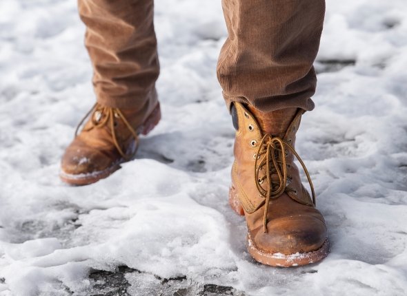 Получившиеся металлические сетки натягиваем на подошвы и носы ботинок. Теперь можно смело выходить на улицу, не боясь упасть на льду. Да, такой вариант — не самый эстетичный, на постоянку он не подходит, но как экстренная мера, безусловно, рабочий.