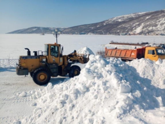 Ротор расширяет проезжую часть на Набережной реки Магаданки и Первомайской. Бульдозеры расчищают снежную свалку, Колымское шоссе.
