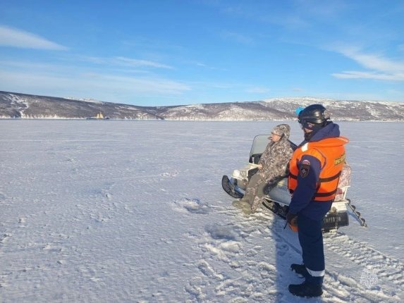 Спасатели патрулируют акваторию, пристально отслеживая перемещения любителей зимней рыбалки. В ходе сегодняшнего рейда на потенциально опасном участке были обнаружены 13 человек, некоторые добрались до места ловли на снегоходах.