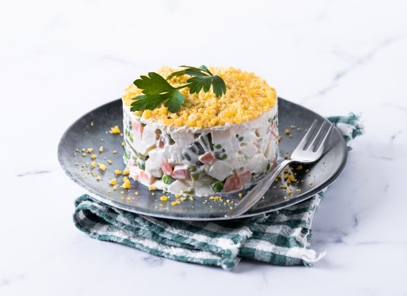 Блюду необходимо настояться в холодильнике 2-3 часа. Салат-торт "Мона" подаём на стол 23 февраля.