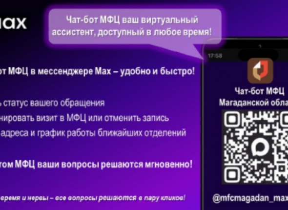 Не нужно никуда звонить или заходить на портал — просто добавьте себе в мессенджер МАХ официальный чат-бот МФЦ Магаданской области. Чат-бот будет всегда под рукой в вашем телефоне и в любой момент можно посмотреть, как продвигается обработка документов, ведь он работает круглосуточно!