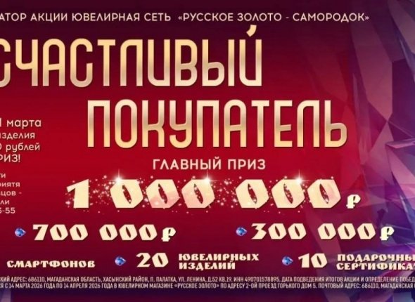 В Магадане завершилась весенняя акция "Счастливый покупатель" от ювелирной сети "Русское Золото — Самородок" Для участия необходимо было купить ювелирное украшение на сумму от 5000 рублей, получить купон и принять участие в розыгрыше.