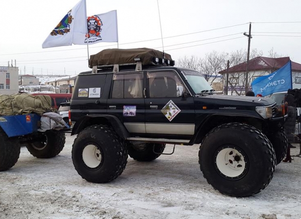 Это очень серьезное мероприятие, в прямом смысле экстремальное. На двух специально построенных автомобилях: трехосном прототипе на базе Suzuki Escudo с дизельным двигателем Nissan и внедорожнике на базе Toyota Landcruser Prado на редукторных мостах Volvo Laplander с прицепом. Оба автомобиля на катках низкого давления.