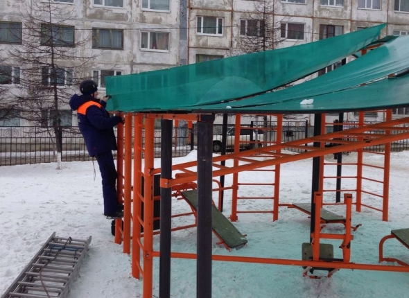 Прибыв на место, спасатели обнаружили, что твердые листы пластика держались "на честном слове". В любую минуту от сильного порыва ветра они могли сорваться с места и причинить вред детям, поскольку тропинка от калитки до крыльца гимназии проходит рядом со спортивным сооружением.